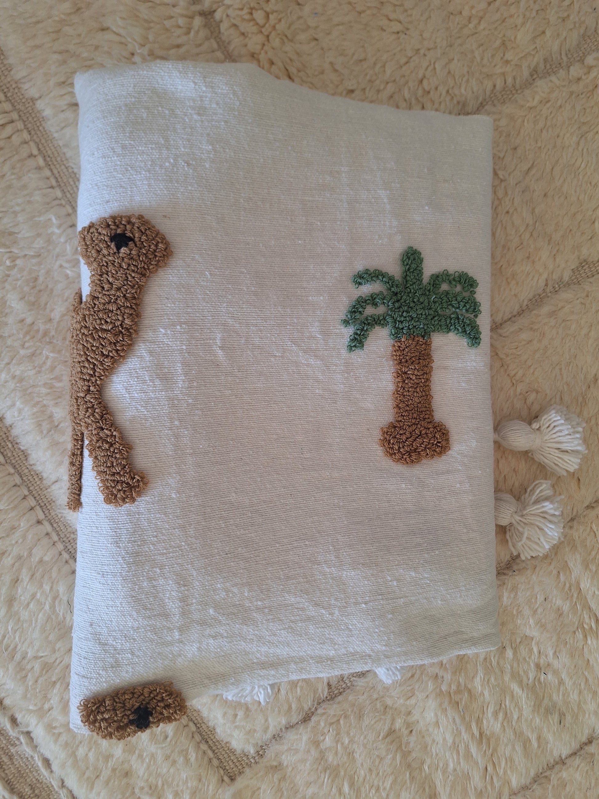Apportez une touche d’authenticité, de chaleur et d’élégance à votre intérieur avec ce plaid brodé berbère et deux housses de coussin en coton et laine, entièrement tissé à la main au Maroc.