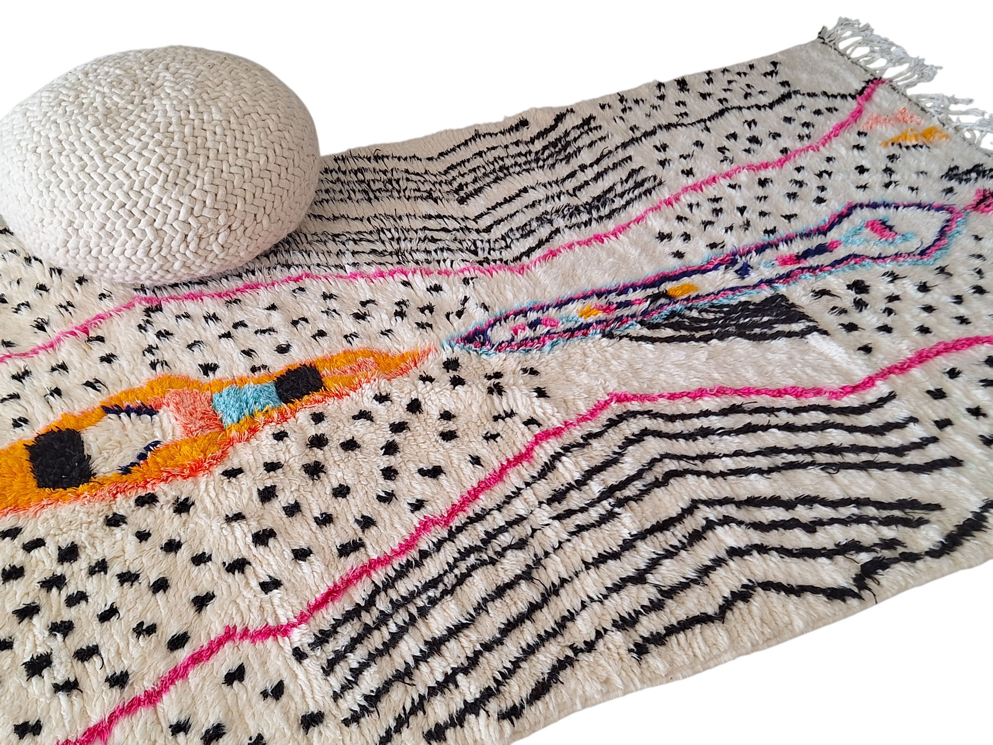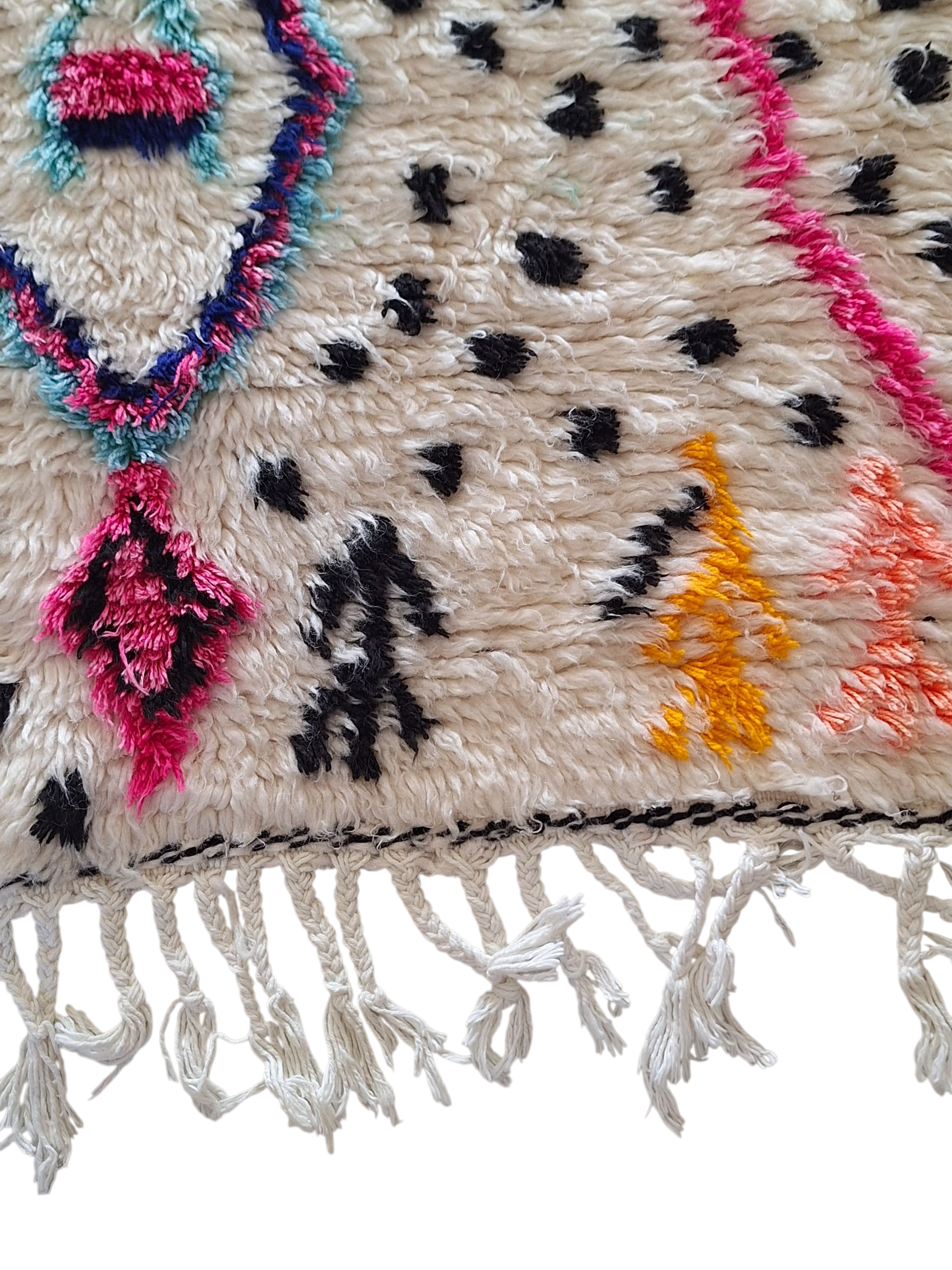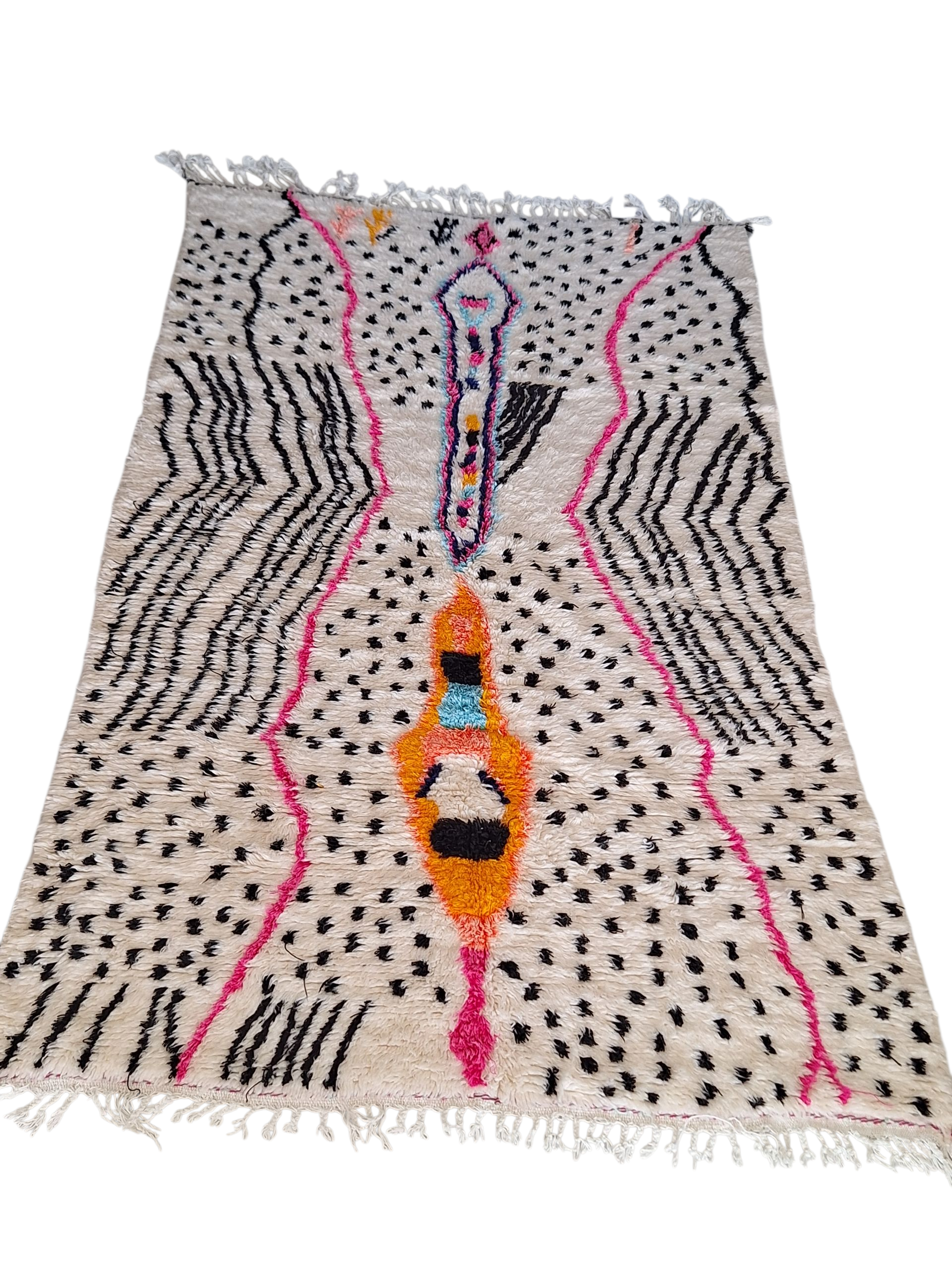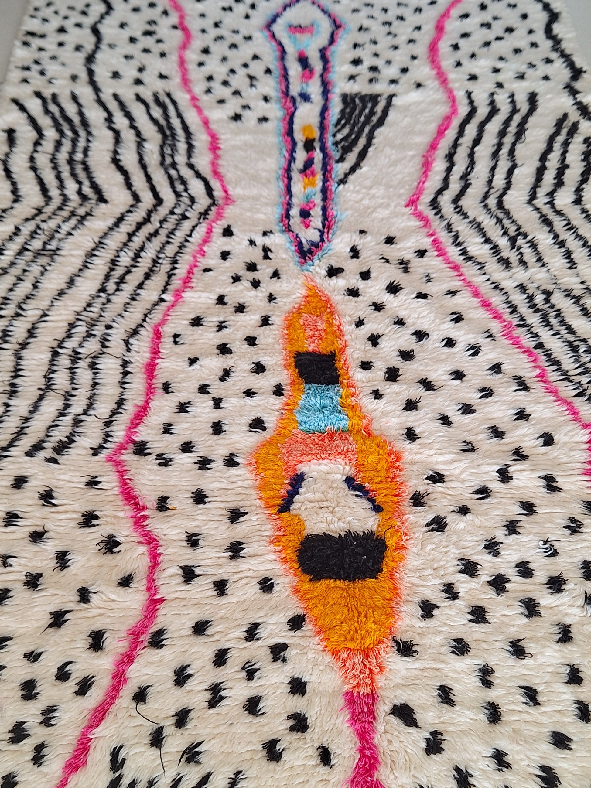 Découvrez la beauté authentique de ce tapis berbère Azilal coloré, une pièce unique tissée à la main au cœur des montagnes du Haut Atlas marocain. Véritable œuvre d’art artisanale, chaque tapis Azilal raconte une histoire à travers ses motifs tribaux et symboliques, inspirés de l’imaginaire et des croyances des femmes berbères qui le créent.