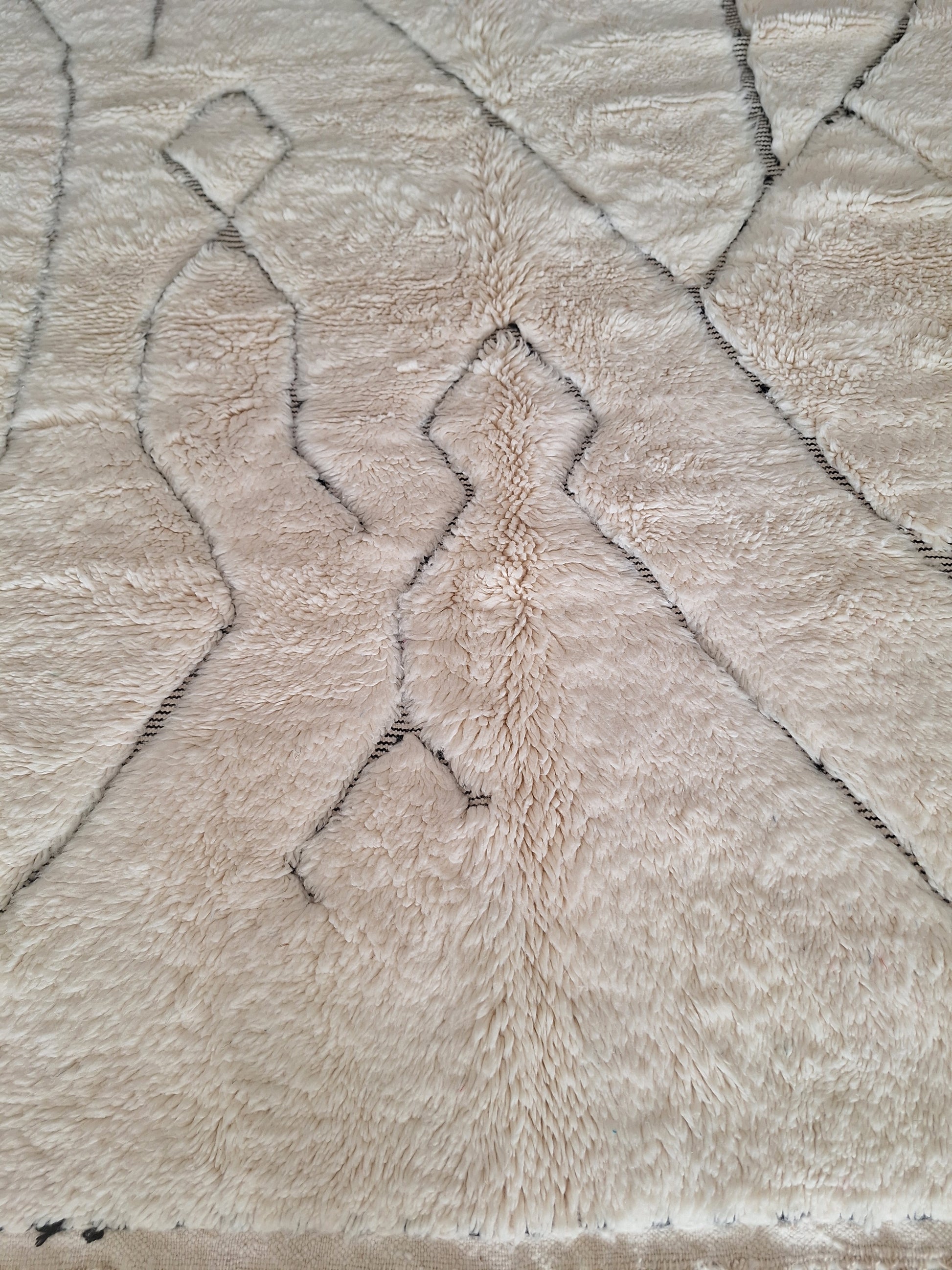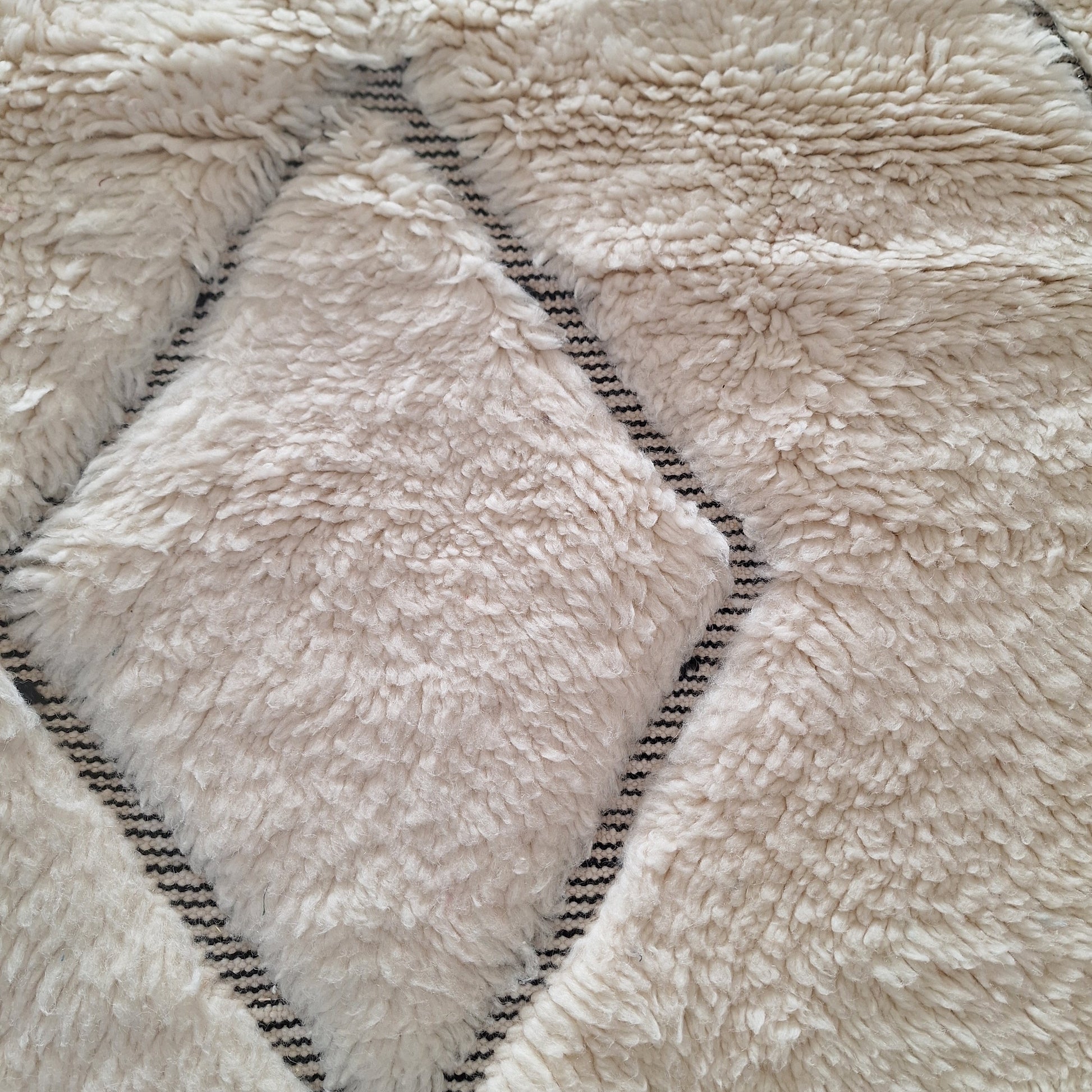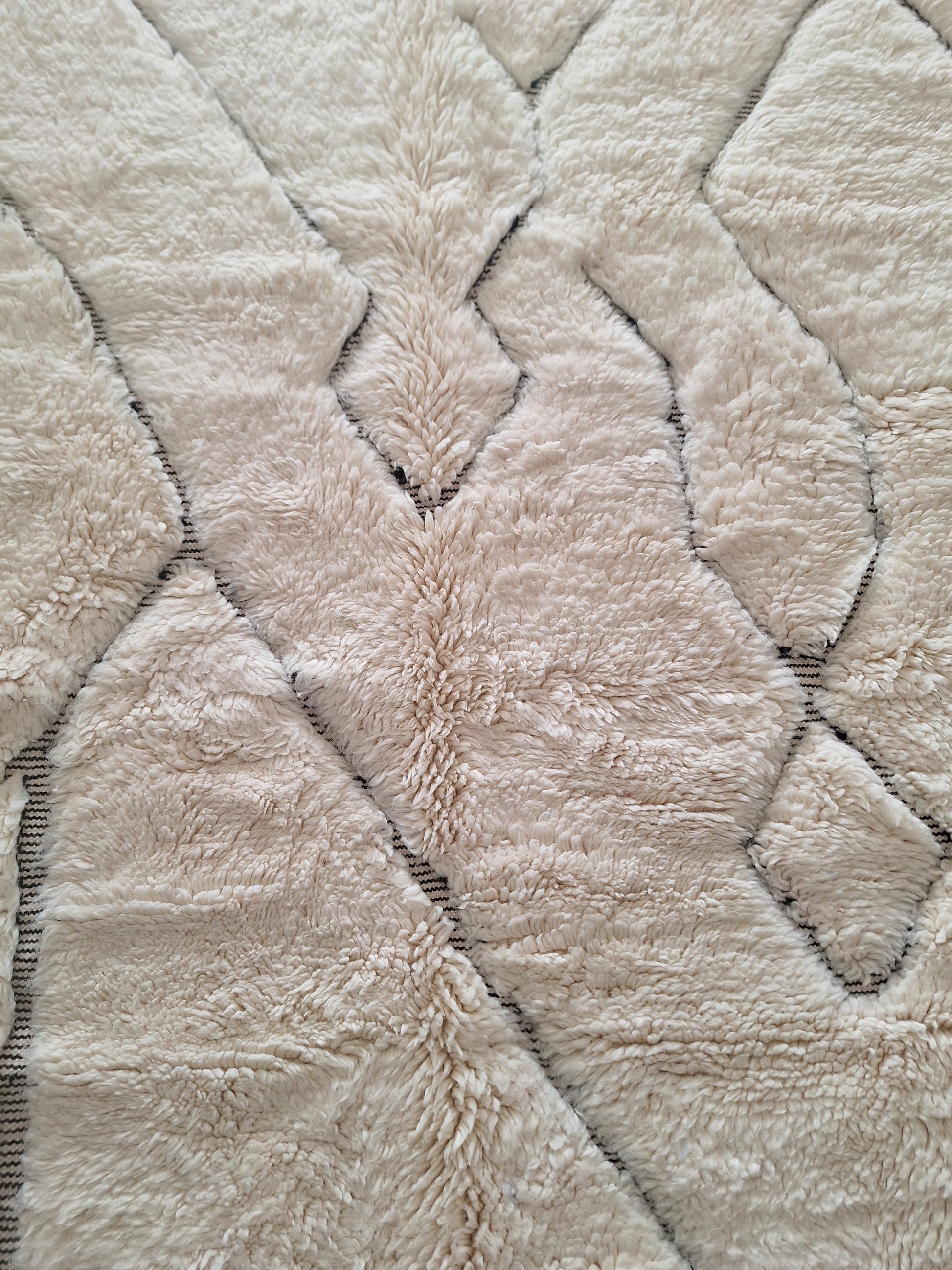Réalisé en laine vierge 100 % naturelle, ce tapis marocain offre une douceur incomparable et un moelleux unique. Ses motifs géométriques noirs tissés dans la trame, en font une pièce d’art intemporelle, capable de sublimer tous les styles d’intérieur — du plus moderne au plus bohème.